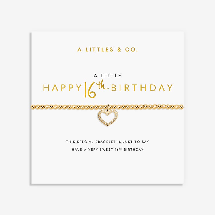 Celebrate a sweet 16 in style with our A Little "Happy 16th Birthday" Bracelet. This stunning piece features delicate gold-plated beads, a sparkling heart charm, and dazzling pav? crystals that catch the light beautifully. It's the perfect accessory to add a touch of elegance and glamour to any birthday outfit. Whether you're treating yourself or surprising a loved one, this bracelet is sure to make a statement and be cherished for years to come. Make their 16th birthday extra special with this timeless and sophisticated piece.