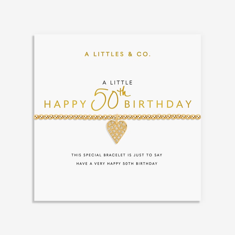 Celebrate a milestone birthday in style with our A Little "Happy 50th Birthday" Bracelet. This elegant piece features a stunning gold-plated beaded design, accented with a shimmering heart charm and pav? crystals for a touch of sparkle. Perfect for adding a touch of sophistication and glamour to any birthday outfit, this bracelet is a thoughtful gift for someone special or a treat for yourself. Make a statement and mark this special occasion with a piece that will be cherished for years to come.