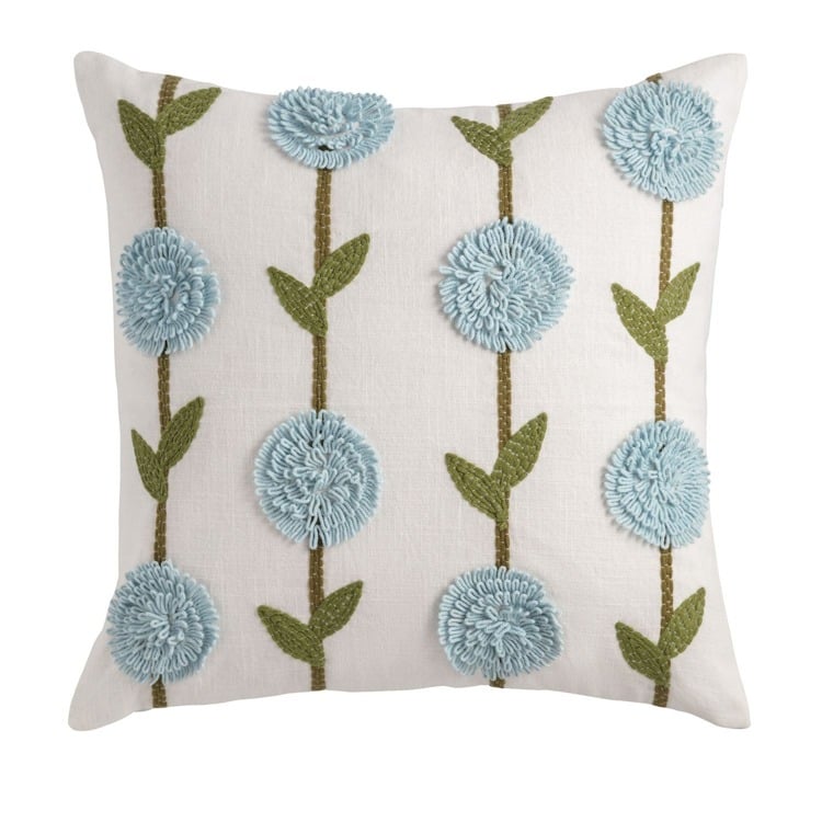 Bring a fresh burst of cheer to any room with this beautifully embroidered throw pillow. Soft blue blooms and textured green leaves dance against a crisp white background, creating a look that's both playful and sophisticated. Beyond its stylish charm, this pillow offers cozy comfort—perfect for relaxing on the couch or brightening up a favorite chair. Durable, made for everyday living, and easy to mix and match, it's just the thing to add a pop of personality and comfort to your decor. Imagine the inviting vibe it will bring to your space!