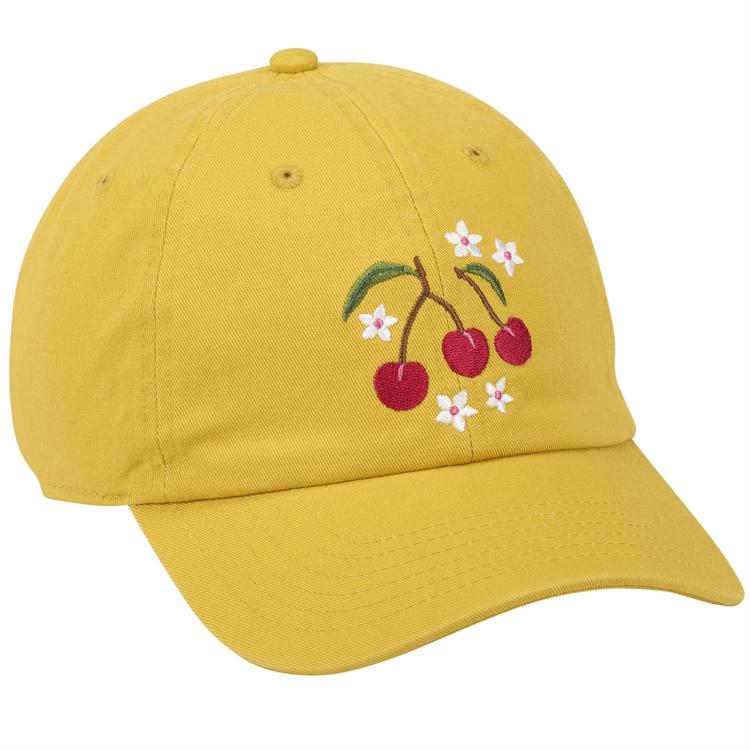Description: A yellow baseball cap from our Inspiration & Blooms Collection displaying embroidered designs of wild cherries and flowers on the front with a coordinating cherry and flower design on the back. Embroidered cherry and flower designs are replicated from original hand illustrated art. Our Cherries baseball cap is one size fits most with an adjustable metal buckle to create the perfect fit. Hand wash only. An charming cherry themed accessory perfect for everyday style and great for gifting.