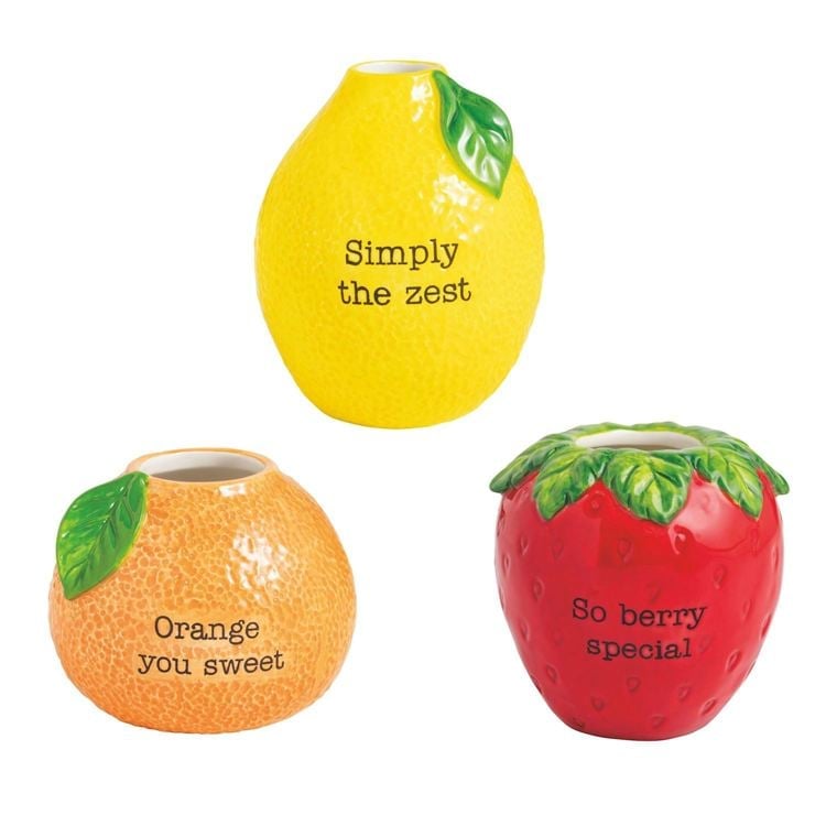 Description: Brighten up any room with this charming set of fruit-shaped mini vases! Each piece serves up playful personality—lemon, orange, and strawberry—paired with uplifting puns like 'Simply the zest,' 'Orange you sweet,' and 'So berry special.' With their vibrant colors and glossy finish, these vases add a cheerful touch to desks, windowsills, or kitchen tables. They're perfect for displaying fresh blooms or as quirky standalone accents. Durable and easy to clean, these vases make every day feel a little fresher and a lot more fun—ideal for gifts or just to sweeten your own space!