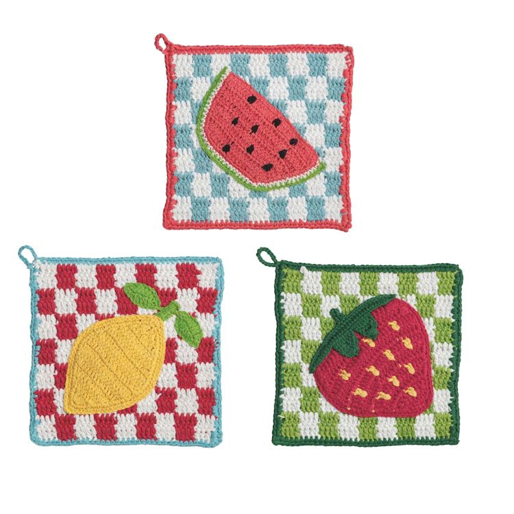 Brighten up your kitchen with these charming crocheted pot holders, featuring playful fruit motifs! Each piece blends vibrant colors and whimsical designs, making everyday cooking feel a little more special. Crafted for practical heat protection and lasting durability, these pot holders also double as cheerful decor with their retro-inspired checkered patterns. Hang them up for a pop of color or use them to handle hot dishes—either way, they add a fun, inviting touch to your home. Perfect as a thoughtful gift or a refreshing update for your own kitchen.