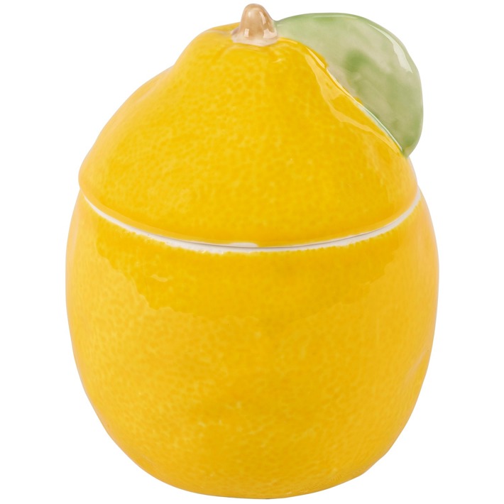 Description: A ceramic cookie jar from our Garden Collection displaying a lemon inspired design with textured glaze finish and sculpted leaf details to resemble the features of a lemon that easily add personality to any tablescape or kitchen. Hand wash only. Our Lemon cookie jar is a fun lemon-themed kitchen accessory perfect for storing everyday treats.
