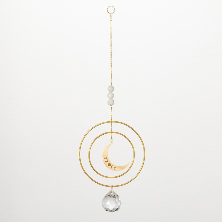 Description: Bring the tranquil beauty of the night sky into your home with this elegant crescent moon suncatcher. A sleek crescent moon symbol sits gracefully within concentric gold-tone rings, offering a minimalist and celestial-inspired design. Below, a faceted crystal prism catches sunlight, creating vibrant rainbows that fill your space with warmth and light. The suncatcher is adorned with three soft white stone beads along a delicate gold chain, evoking purity, serenity, and a connection to the cosmos. Perfect for windows, meditation spaces, or as a thoughtful gift, this suncatcher adds a touch of celestial magic to any setting. Its intricate design and soothing colors make it a beautiful addition to any room, bringing a sense of peace and harmony to your home.