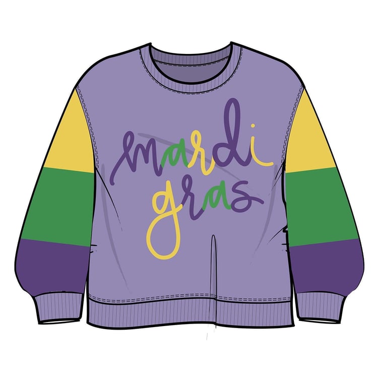 Description: Show off your festive spirit with this vibrant Mardi Gras sweatshirt! The classic crewneck design keeps you ultra-comfy, while the eye-catching purple, green, and gold stripes embody the lively energy of the season. With its playful 'mardi gras' script, this piece brings fun and flair to any outfit, letting you celebrate in style whether you're on the parade route or cozying up at home. Perfect for layering and easy to dress up or down, it’s a must-have for anyone who loves bold style and effortless comfort.